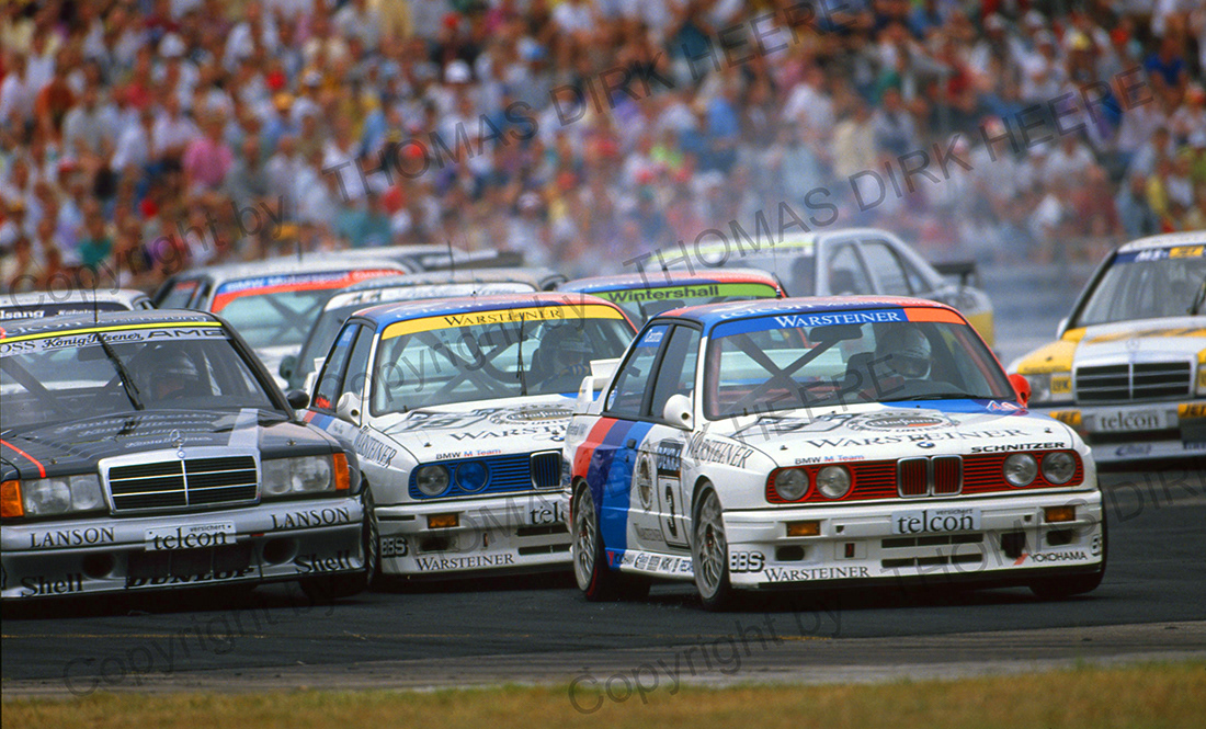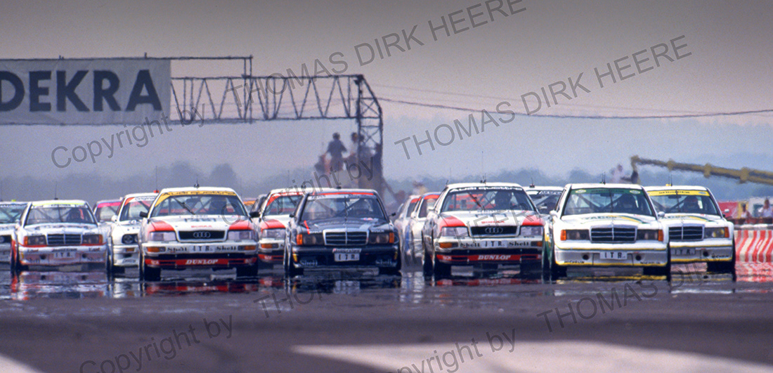 Das ist schon ein imposantes Schauspiel, wenn das Starterfeld der DTM 1991 in Diepholz über den flimmernden Asphalt der Start- und Landebahn auf einen zu rast.