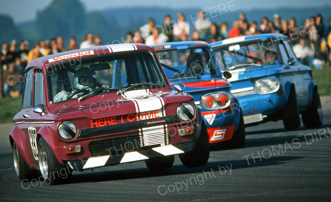 Im Deutschen Rundstrecken-Pokal in der Klasse bis 1000ccm gab es beinharte Kämpfe zwischen den Sunbeam IMP und den NSU-TT. Hier in Führung liegend Klaus Walz beim Rennen in Ulm-Mengen 1975.